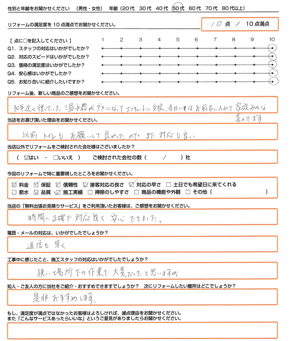 京田辺市 エコキュート取替のお客様のご感想 2025年11月16日 最終更新日時 : 2025年9月12日 2025年11月16日 【お客様のコメント】Q. リフォーム後、新しい商品のご感想をお聞かせください。 30年近く使っていた温水器がダメになってエコキュートに交換、当日にはお風呂に入れて家族みんな喜んでます Q. 当店を選ばれた理由をお聞かせください。 以前トイレもお願いして良かったので また対応も良い Q. 当店以外でリフォームを検討された会社様はございましたか? はい 【ご検討された会社の数】 1社 Q. 今回のリフォームで特に重要視したところをお聞かせください 料金・保証・信頼性・接客対応の良さ・対応の早さ・品質・施工実績 Q. 当店の「無料出張お見積りサービス」をご利用頂いたお客様は、ご感想をお聞かせください 時間に正確で対応良く安心できました。 Q. 電話・メールの対応は、いかがでしたでしょうか? 返信も早く Q. 工事中に感じたこと、施工スタッフの対応はいかがでしたでしょうか? 狭い場所での作業で大変だったと思いますが Q. 知人・ご友人の方に当社をご紹介・おすすめできますでしょうか?次にリフォームしたい箇所はどこでしょうか? 是非おすすめします。 Q. もし、満足度が満点ではなかったお客様はよろしければ、減点理由をお聞かせください。また「こんなサービスあったらいいな」というご意見がありましたらお聞かせください。 ―