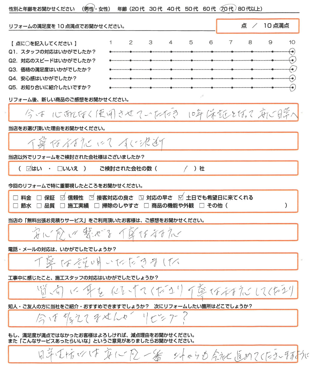 今は心配なく使用させていただき 10年保証となって安心日常へ